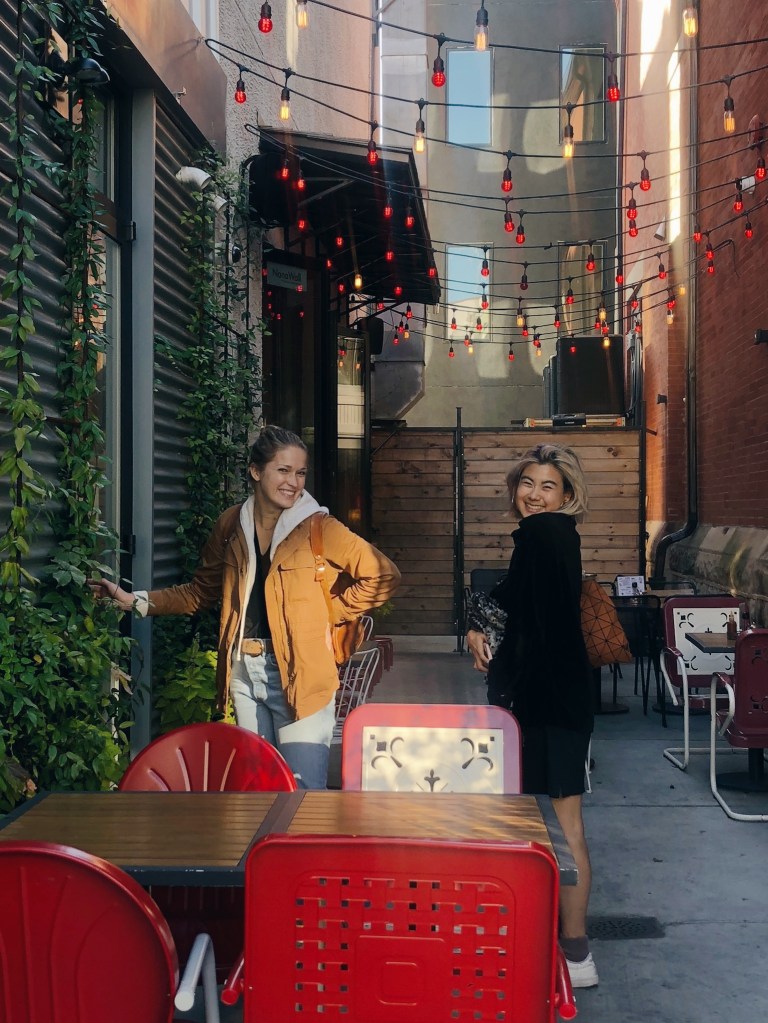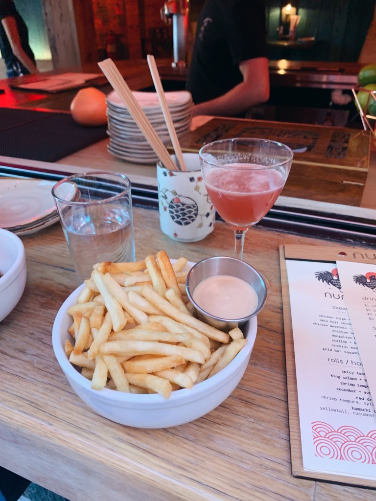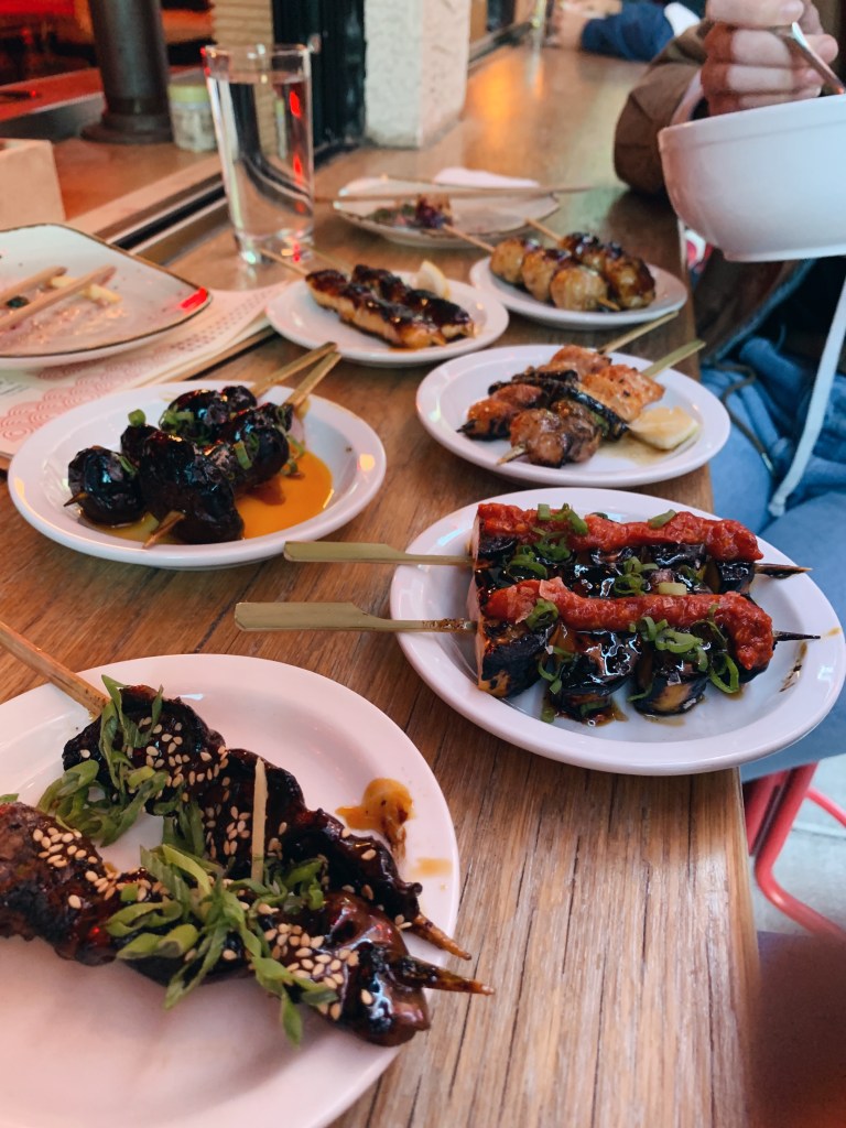 Because we are nothing if not punctual, we showed up at Nunu Bar for happy hour at around 4:55. The deals here are incredible and the interior of the bar is flooded with striking red light from dozens of lanterns hanging from the ceiling. There are intimate booths inside, but we opted to sit at the outdoor bar and proceeded to order nearly everything on the happy hour menu, including a multitude of skewers, fries, salad, and a cocktail. You know – balance.
